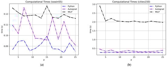 Figure 7 presents the computational times for the two Lagrangian algorithms and the MILP solver for the two datasets. For the smaller swain55 dataset, significant fluctuations in the computational time can be observed in Figure 7a. There is no clear conclusion as to which algorithm is faster. But the solution times are generally small. On average, the original, the autograd, and the MILP algorithms took 0.09, 0.10, and 0.12 s, respectively. These fluctuations may be caused by the random delays in loading data between the disk, the memory, and the CPU. For the larger cities150 dataset, Figure 7b shows that the computational time for all three methods are longer and there is a clear pattern, with the original algorithm taking the shortest time, the autograd taking a slightly longer time, and the MILP algorithm being the slowest. On average, the original, the autograd, and the MILP algorithms took 0.27, 0.35, and 2.1 s, respectively.