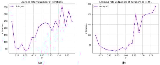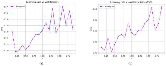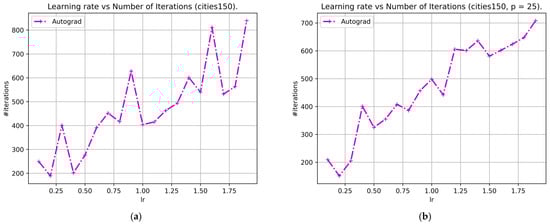 Figure 9 presents the sensitivity of  for the larger cities150 dataset. For p = 5 (Figure 9a) and p = 25 (Figure 9b), the number of iterations to termination ranges from about 190 to 830, and from about 210 to 710, respectively. Once more, the algorithm converges faster when the learning rate is within the 0.2 to 0.8 range. It seems that the learning rate should not be too small or too large. Otherwise, the number of steps to convergence can increase significantly.