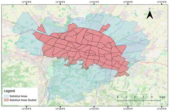 Our study observed an ancient city in the center of Italy: the municipality of Bologna covers a total area of 141 km2, with a population of nearly 390,000 as of 2023. The territory includes six districts and is divided into 18 zones and 2333 census sections defined by the Istat (Italian National Institute of Statistics) in the general censuses. Furthermore, Bologna is divided into 90 statistical areas: this subdivision responds to the need to define a more fine-grained reading “grid” than the traditional subdivision of Bologna into neighborhoods or zones and that at the same time is more concise than the subdivision into census sections [].