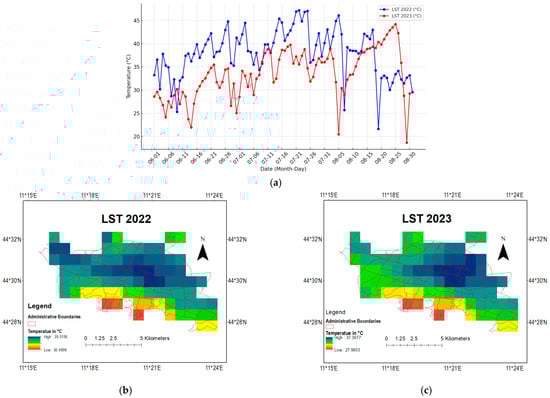 (a) LST time series at 4:00 pm for the study area in Bologna, Italy, during June, July, and August in 2022 (blue) and 2023 (red), showing daily temperature variations. (b,c) LST spatial maps for the same period in 2022 and 2023.