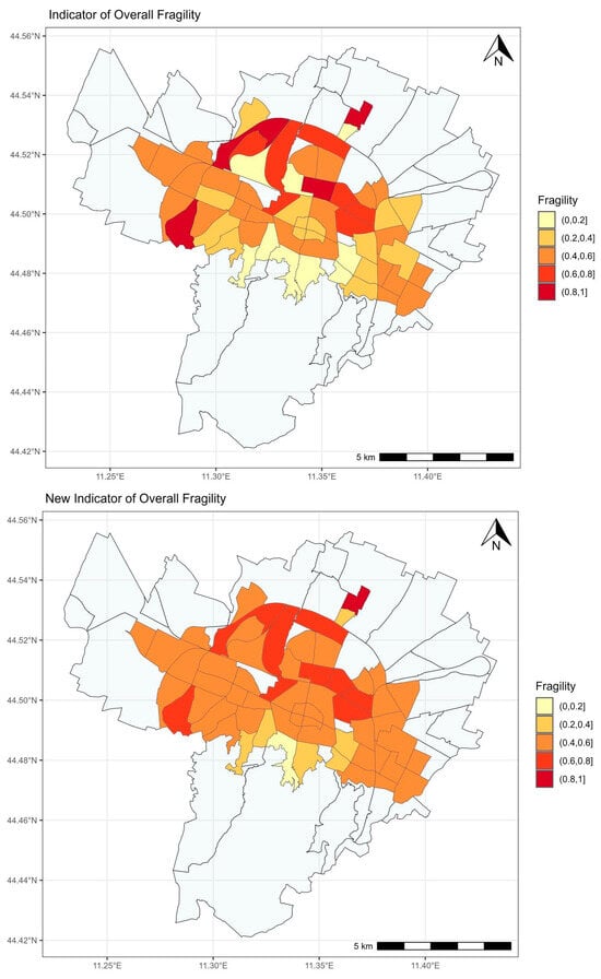 Comparison between the indicator of overall fragility calculated by the municipality of Bologna, considering economic, social, and demographic fragility, and the new indicator of overall fragility, calculated also considering social vulnerability to extreme heat. Both indices are normalized.