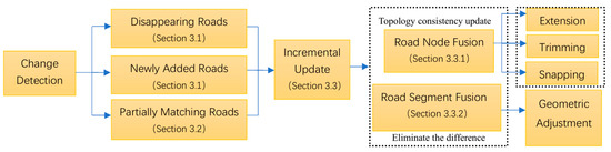 To address these challenges, this paper is dedicated to detecting changes in multi-source vector road networks and, on this basis, achieving seamless incremental data updates while preserving topological consistency before and after the updates as much as possible. The proposed methods are specially designed for certain specific application scenarios: that is, applying the road centerline data of official agencies to update the commercial navigation road network. Unlike the existing road network match-based updating algorithms, the core aim of this paper is to demonstrate that, when comparing two sets of road network data that possess high geometric accuracy, geometric change detection and the incremental updating of road networks can still be efficiently achieved without relying on sophisticated road network matching algorithms.