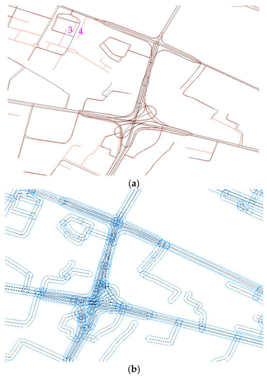 The results of the change detection of the two sets of vector road network. (a) Recognition of newly added roads (refer to the road features that exist in the reference road network but not in the target road network); (b) recognition of deleted roads (refer to the road features that exist in the target road network but not in the reference road network).