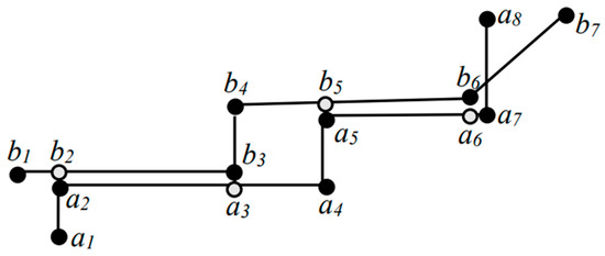 Step 2: For each vertex of road feature a, we compute its shortest distance to road feature b. If this distance falls below a predefined buffer radius threshold, the corresponding point on road feature b with the shortest distance is designated as its matching point (refer to the white points in Figure 3). The reverse process is also performed, ensuring symmetry in the matching process. As depicted in Figure 3, subsequent to identifying matching points for each feature, the original set of six vertices (depicted as black points) of road feature a is augmented with two matching points (white points), resulting in a new point set of eight vertices for feature a. Similarly, the two matching points are added to the original five vertices of road feature b, expanding its vertex set to seven points.