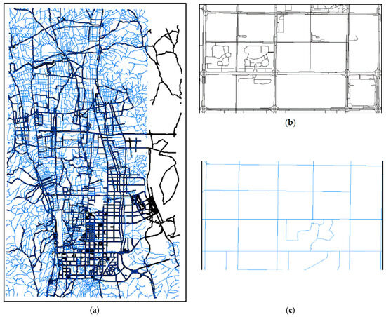 Two sets of vector road networks ready for change detection and update. (a) Two sets of road networks overlap; (b) the main urban roads of the commercial navigation road network are represented by parallel lines; (c) the roads of the official fundamental vector road network are represented by center lines.