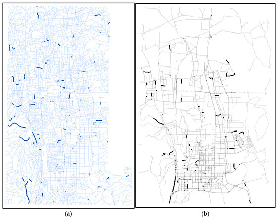 Considering that the geometric accuracy of the road network data sourced from these two sources is commendable, the buffer radius threshold has been set to 30 m. Taking into account that a single lane measures 3.75 m wide, the threshold is based on the maximum width of a two-way eight-lane road. Regarding the setting of the buffer radius parameter, reference [30] also provides supplemental discussions. Additionally, in Section 3, a similarity threshold of 0.85 has been established for partial matching detection. Following the procedures outlined in Section 3, our proposed algorithm efficiently discovers changes between the two sets of vector road networks. Our analysis reveals that 5186 road features in the reference road network lack corresponding matches in the target road network. Consequently, for the target road network, these can be considered newly added road features, as illustrated by the thick blue solid line in Figure 8a. Conversely, 2355 road features in the target road network have no counterparts in the reference road network, indicating that they have been deleted from the reference network, as depicted by the thick black solid line in Figure 8b.