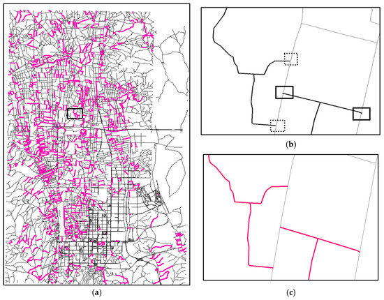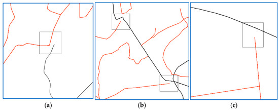 In addition to the road features that underwent successful snapping, an additional 186 features remained unsuccessfully aligned. The designed algorithm automatically identifies these instances and subsequently refers them to a human operator for further verification. Figure 13a–c present three illustrative examples of such unsuccessful snapping, highlighted within the respective boxes. The underlying reason for the failure, in each case, lies in the fact that although the proximity of the newly integrated road feature to its intended target falls within the prescribed threshold range, the necessary adjustment of its endpoint would result in a significant alteration of shape or exceed the road node fusion distance limit.