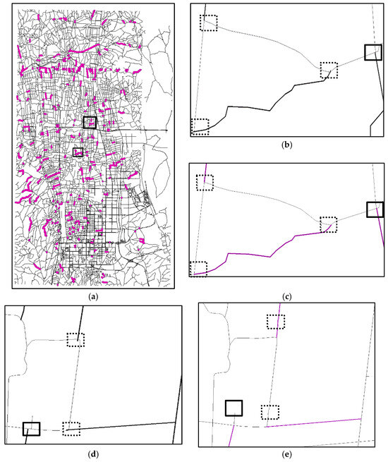 In Figure 12a, a total of 294 road features have undergone automatic snapping to either road intersections or critical turning points post-data integration, as guided by Section 4. This process is indicated by the purple-red thick line. Figure 12b,c present zoomed-in views of the lower boxed area in Figure 12a, whereas Figure 12d,e showcase the upper boxed area. Notably, within the dashed line boxes of Figure 12b,d, the road nodes need to be snapped to critical turning points, while within the dashed line boxes, the road nodes need to be snapped to road intersections. Figure 12c,e display the outcomes of the algorithm outlined in Section 4, again marked by the purple-red thick line. These results demonstrate that the fusion and update of road features have been successfully completed, effectively preserving the topological consistency of the road network before and after the update process.