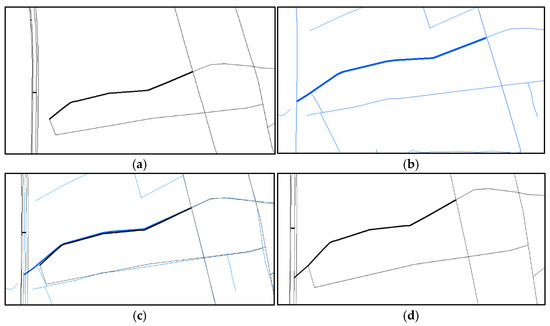 Figure 14, Figure 15 and Figure 16 present relevant examples, solely emphasizing the fusion and update results involving partial matching road features, while disregarding the updates of other road features. Specifically, Figure 14a depicts the target road feature, which has undergone extension and updating based on the reference road features presented in Figure 14b. The outcomes of this process are visualized in Figure 14c, denoted by the black line, clearly demonstrating the elimination of geometric conflicts and the preservation of geometric consistency in Figure 14d.