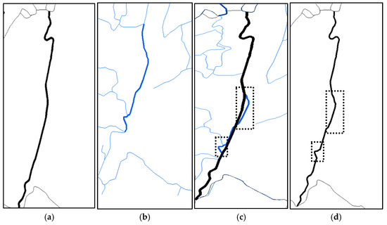 Partial substitution update of two road features that partially matched. (a) The target road feature; (b) the reference road feature; (c) two road features overlap; (d) partial substitution.