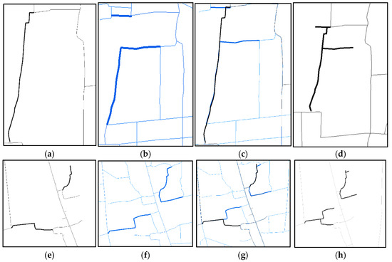 Figure 16 presents two additional sets of road features (Figure 16a–h) that exhibit partial matching characteristics. In these examples, the target road features, depicted with black thick solid lines, partially matched with the reference road features shown with blue thick solid lines. Similar to the approach used in Figure 15, the method outlined in Section 4 is employed to identify and extract the inconsistent segments between the two road features. However, in contrast to Figure 15, here the target road features remain unmodified, while the detected inconsistencies undergo local coordinate transformation and are fully integrated into the target road features, as per the guidelines in Section 4. Figure 16c,g clearly illustrate the partial matching relationship between the road features when they are overlaid. Following the elimination of conflicts and inconsistent parts, Figure 16d,h showcase the results of the fusion and update process, demonstrating the successful integration of the reference road feature’s information into the target road features while maintaining overall consistency.