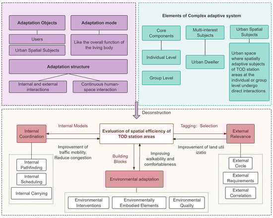 The general significance of the model of complex adaptive systems is that the subject adjusts its own “reaction rules” by constantly and actively adapting to changes in external stimuli, thus realizing the integration and optimization of internal elements. Introducing the CAS helps understand TOD metro areas. From the perspective of the design and development of TOD metro station areas, and combining the seven basic characteristics of a CAS, the framework of complex adaptive systems of TOD metro station areas are summarized in Figure 2.