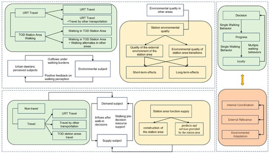 The TOD system supports diverse people from different areas for various purposes. Behavioral activities in the station area have multiple origins [45]. The TOD system needs to maintain dynamic stability while coping with a great variety of usage behaviors, reflecting the adaptive subjective stress. The development process includes ephemeral aspects and evolves through interactions. Therefore, in the part of external correlation, this paper selects the three parts of the external circle, external requirements, and external correlation as the basis of the factor system.