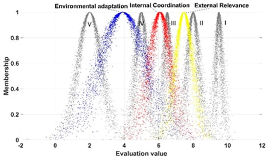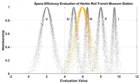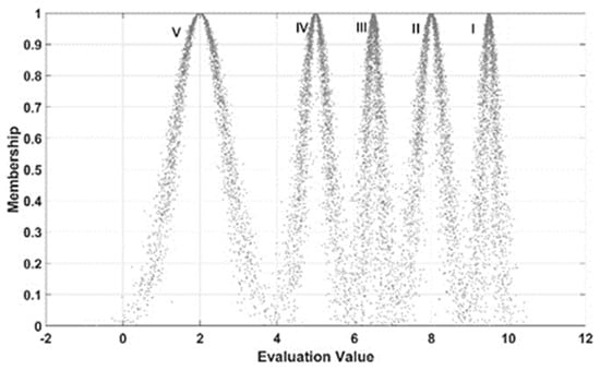 After extensive adjustments, we determined the value of He to be 0.1. Utilizing the evaluation levels established previously, we can construct a standard cloud model to assess the spatial efficiency of TOD metro station areas. This model will allow us to visually and quantitatively represent the spatial efficiency, enabling stakeholders to better understand the performance and effectiveness of development strategies in these areas. This cloud consists of five levels of information. The numerical characteristics of the cloud in Table 4 are utilized to write code and draw the standard cloud diagram of evaluation using MATLAB R2023a software. Each variable, , , and is defined for five different evaluations. These parameters represent the expected value, entropy, and hyper-entropy for different evaluations of space efficiency. A loop iterates N times (N = 3000) to generate cloud drops. For each iteration: Random values for entropy are generated using a normal distribution. Cloud drops (representing evaluation values and their corresponding membership degrees) are calculated based on and the generated entropy values. The resulting membership degree is derived using an exponential function that measures how closely each evaluation corresponds to the expected value, creating a concentrated distribution around .