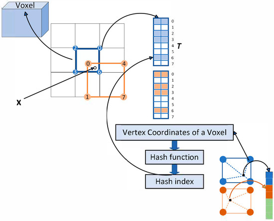 Sampling points are encapsulated within voxel cubes located in 3D space, and the coordinates of these voxels are input into a hash function. In this example, the hash function is given by Equation (5). Here, represents the hash index, and is the limitation on the size of the hash index due to the operation denoted by .