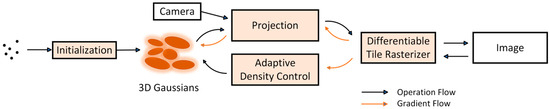 The Three-Dimensional Gaussian Splatting (3DGS) technique defines the radiance field in a 3D scene on a discrete cloud of 3D Gaussian points to enable differentiable volume rendering. The technical process is illustrated in Figure 2. In 3DGS, each point is represented as an independent 3D Gaussian distribution [33], which can be mathematically expressed as Equation (6) below: