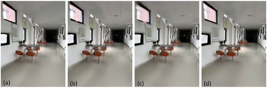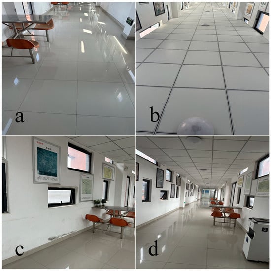To enable a comprehensive and detailed evaluation of the algorithm, the corridor located on the fourth floor of the School of Aerospace Surveying and Mapping at Anhui University of Science and Technology has been designated as the testing environment, as depicted in Figure 3. This corridor, measuring a total length of 15 m, exhibits a highly diverse environmental design. It incorporates hanging decorations, a meticulously organized arrangement of tables and chairs, pristine white walls, transparent glass structures, and prominent corner elements. Collectively, these features create a testing space that is both unique and broadly representative.