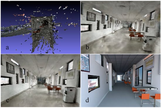 During the preliminary exploration phase, significant technical difficulties emerged when utilizing CC to process complex scenes characterized by extensive areas of white walls and floors. Specifically, conventional three-dimensional reconstruction algorithms encountered challenges in extracting an adequate number of feature points from these expansive white surfaces, which resulted in unsuccessful feature matching. This limitation subsequently hindered precise registration during the aerial triangulation phase, ultimately leading to unsuccessful modeling outcomes. To mitigate this issue and achieve a comprehensive model, a substantial increase in the dataset was considered, resulting in the incorporation of 895 unrestricted photographs for re-modeling through CC, as illustrated in Figure 5a. Although initial modeling results were obtained, the output displayed significant voids and protrusions, and manual remediation proved to be inefficient. Consequently, OSketch Up software(V1.0) was employed, leveraging its interactive object-based modeling capabilities to enhance the preliminary CC model, as depicted in Figure 6c,d. This integration significantly improved processing efficiency and effectively reduced the time required for manual corrections. Ultimately, by combining the functionalities of both software tools, a successful object-based construction of the model was realized, with the final result presented in Figure 6b, thereby accomplishing both efficient and accurate three-dimensional model reconstruction.