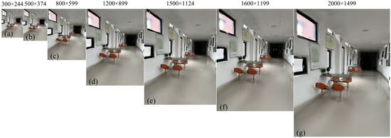 Comparison of dimensions for rendered images at various resolutions. (a–g) represent rendered images with resolutions of 0.3 k, 0.5 k, 0.8 k, 1.2 k, 1.5 k, 1.6 k, and 2 k, respectively.