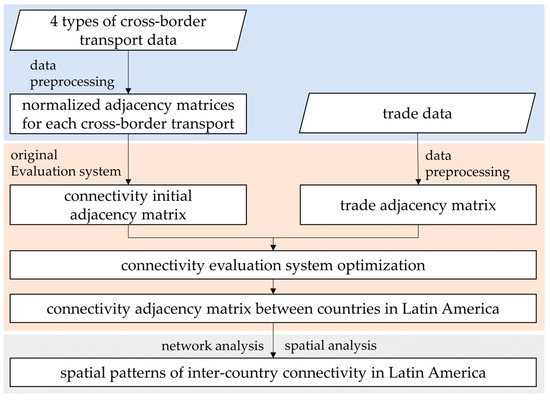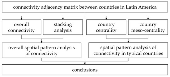 In this article, network analysis was used to construct indicators measuring different perspectives on connectivity and combined with visual representations to analyze the spatial patterns of connectivity among Latin American countries, with the basic process shown in Figure 6.