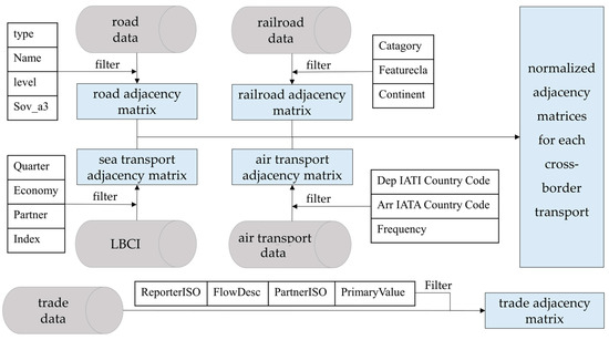 Using the attribute information contained in cross-border roads and railroads, cross-border roads and railroads were screened with the restriction of crossing the border line, and the cross-border road and railroad adjacency matrix between Latin American countries was constructed. For sea transport, the temporal resolution of the LBCI was quarterly, using 2020 data, filtered and averaged to obtain the sea transport adjacency matrix between Latin American countries. The air transport data mainly included the number of routes and the number of flights, and the air transport adjacency matrix between Latin American countries was obtained by crawling the data. The above adjacency matrices for sea, road, rail, and air transport were normalized and used as inputs for the connectivity calculations below using the expert scoring method. The trade adjacency matrix, on the other hand, serves as a comparison for the accuracy of the connectivity adjacency matrix. The data preprocessing steps are shown in Figure 3.