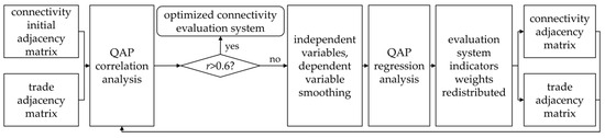 The QAP correlation analysis was used to calculate the connectivity initial adjacency matrix and trade adjacency matrix correlation to test the strength of correlation between two adjacency matrices and their significance level, the basic principle of which is shown in Figure 2a. If the calculated correlation coefficients reached a strong correlation (r ≥ 0.6) and were within the significant level (p < 0.01), there was no need to adjust the weights of the indicators for the original evaluation system of connectivity. If it did not reach a strong correlation (r < 0.6) or was not within the level of significance (p ≥ 0.01), the original evaluation system of connectivity needed to be adjusted to the weights of the indicators in order to reach a strong correlation and significance level.
