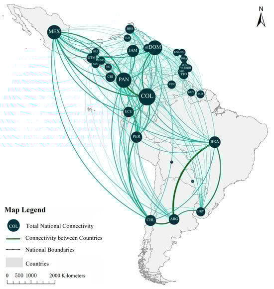 The calculated inter-country connectivity results (adjacency matrix) for Latin America were visualized in conjunction with a map to obtain Figure 5, as shown below. The nodes in the figure are the 33 sovereign countries in Latin America, the center of the node is the geometric center of the country vector surface data, and the size of the node is the sum of the connectivity between the different countries and the rest of the countries in the study area; the edges indicate the inter-country connectivity, and the larger the value of the connectivity, the wider the edge.
