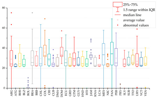 The overall connectivity among Latin American countries has been calculated to be 26.022. As shown by the box plot of connectivity among Latin American countries (Figure 7), the average value of connectivity between a Latin American country and other countries in the region was generally in the range of 20–30, with only a small number of countries having an average value of connectivity with other countries in the region exceeding 30, and individual countries having a connectivity greater than 50. Therefore, it could be argued that the overall connectivity among Latin American countries was low and the level of regional cross-border transport was underdeveloped.