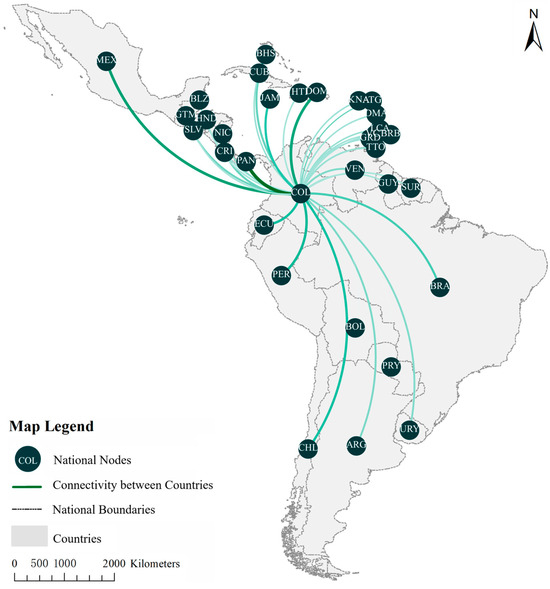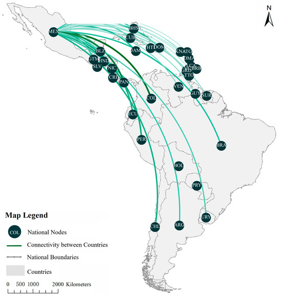 Spatial patterns of connectivity between Colombia and regional countries.