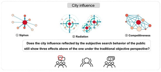 Despite progress, the research on city influence still mainly focuses on qualitative or quantitative analyses from an objective perspective, often in a static and descriptive manner [16,17,18]. These studies primarily concentrate on the objective attributes of certain aspects of cities, with little attention paid to people’s behaviors, preferences, and needs. In the internet era, individual cognition and behavior play a crucial role in societal development [19]. Assessing city influence from public search behaviors is of significant importance for guiding urban policymakers in taking measures to enhance the city’s image [20]. Public search behavior is a relatively low-cost human activity, with broad coverage, and can effectively reflect city influence from a bottom-up perspective [21]. Therefore, analyzing this search behavior to reflect city influence is feasible. Moreover, can the city influence reflected from a bottom-up perspective also manifest the siphon, radiation, and competition effects seen in traditional objective perspectives (such as finance and population)? If so, what spatial structure does this influence exhibit?