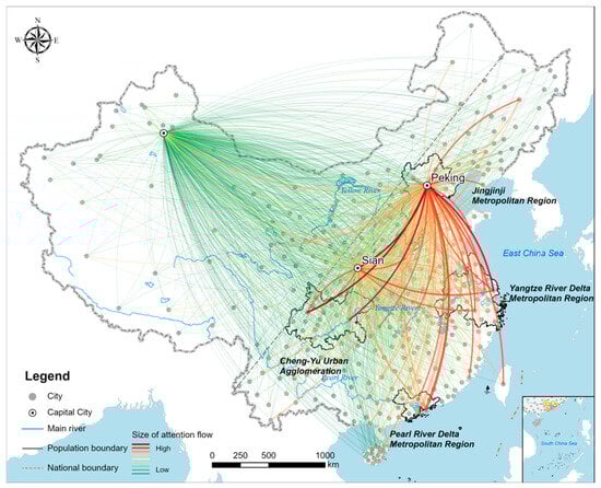 As shown in Figure 4b, attention flow with spatial attributes changes with variations in the starting point, destination, and search frequency. When the starting and ending points of attention flow are both cities, i.e., when people are spatially positioned by a city unit and the concerned object is also a city, attention flow can be expressed as people in a city paying attention to other cities in a geographical sense. For example, people in Beijing may be interested in the history and cityscape of Shanghai and want to obtain the relevant information, leading to an online search for “Shanghai”, thereby creating an attention flow from Beijing to Shanghai. Attention flow with a regional attribute reflects the fusion of geographic and flow spaces. Exploring the spatial effects of attention flow offers insights into human society and provides a new approach for the correlation analysis between regions.