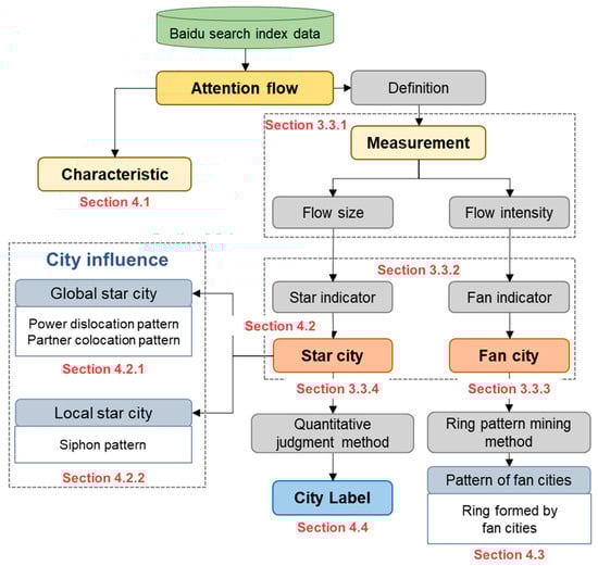 This study proposes a measurement and analysis method based on attention flow to capture city influence and inter-city interactions. The research framework is shown in Figure 3. First, the concept of attention flow is defined, and its implications are analyzed. Second, calculation methods for the size and intensity of attention flow are developed. Third, star cities with higher influence and fan cities with stronger interactions with specific star cities are identified. Star cities are classified into two categories: global and local star cities, based on analytic scales (global or local). Next, the spatial distribution characteristics of star cities and the circular spatial relationship between star cities and their fan cities, including Euclidean distance and azimuth characteristics, are analyzed. The correlation patterns are classified into three basic ring patterns: short-distance, medium-distance, and long-distance. The spatial correlation characteristics combine the three basic patterns. Finally, the matching rules between star and fan cities are identified.