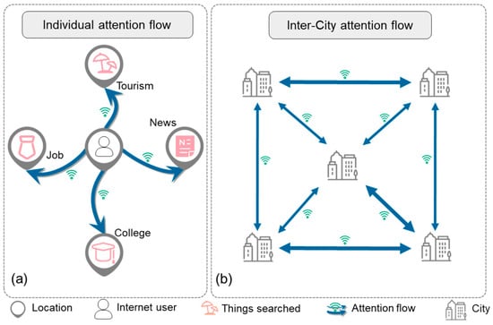 The development of Internet technology has placed human beings in an environment where their location can be recorded at any time [37]. People use search engines to access information, which may include that on geographic locations. The behavior of obtaining location-related information through search engines essentially reflects the need to focus on certain location-related topics [38]. As shown in Figure 4a, when people are interested in or seeking information about tourist attractions, jobs, schools, or current events, they search for related information. These objects are inherently location-based, establishing a link between the geographic location of users and the relevant objects. The relationship between the two is based on users’ search behavior. From this understanding, attention flow is defined as follows: