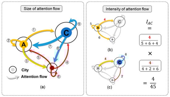 where represents the relative importance of attention flow from City to City , with the two fractions in the formula indicating the significance of to the respective origin and destination cities. The product of these fractions provides the composite intensity of the attention flow , as demonstrated in the calculation of in Table 2 and Figure 5b,c. The first fraction in Formula (1) is shown in Figure 5b, indicating the importance of to City A, and its value is . The second fraction, as shown in Figure 5c, represents the importance of to the concerned City C, and its value is . The product of the two fractions is the intensity of attention flow , and its value is .