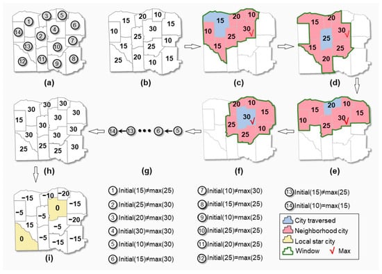 As shown in Figure 6, 14 cities are included within the research scope (Figure 6a), the initial value is the local SI value of each city (Figure 6b), and the size of the local scanning window k = 7. When the serial number of the central city is 1, the maximum value of local SI in the scanning window is 30 (Figure 6c). When the serial number of the central city is 2, the maximum value of local SI in the scanning window is 30 (Figure 6d). When the serial number of the central city is 3, the maximum value of local SI in the scanning window is 30 (Figure 6e). When the serial number of the central city is 4, the maximum value of local SI in the scanning window is 30 (Figure 6f). Traversing each city (Figure 6g), the maximum value of the scanning window is assigned to the corresponding central city to obtain an updated value (Figure 6h). The updated value is subtracted from the initial value, and the city with the result of 0 is identified as the local star city in its local region (Figure 6i).