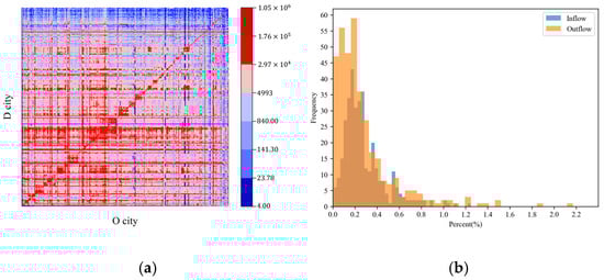 The frequency histogram of the inflow and outflow proportions, relative to their total values, is shown in Figure 7b. The inflow and outflow values follow a normal distribution, while the outflow values conform to a power-law distribution, and the distribution is relatively concentrated in the 0.15–0.3% and 0–0.25% segments, respectively.
