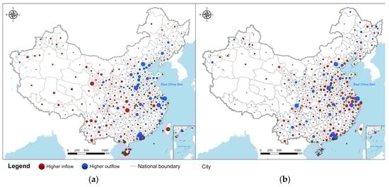 Difference between outflow and inflow of each city. (a) Difference from a global perspective. (b) Difference from a local perspective.
