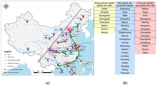 - From a grassroots perspective, globally and locally recognized star cities and provincial capitals form six pairs of power dislocation patterns, five pairs of partner co-location patterns, and seven pairs of siphon patterns, particularly evident in China’s major urban agglomerations, indicating the importance of city interactions for regional sustainable development.