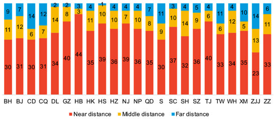 According to the calculation results (Figure 11), most of the fan cities of all the star cities are distributed within a relatively short distance. Moreover, for most of the star cities, the number of fan cities with a medium distance from them is more than those with a far distance from them, indicating a decreasing influence effect with increasing distance. Geographical distance also affects the spread of city influence. For Taipei, Xiamen, Xi’an, Chongqing, Chengdu, and Zhangjiajie, the number of fan cities with a medium distance from them is less than those with a far distance from these cities. These star cities are popular tourist cities in the study area, indicating that the influence of tourist cities has a wide radiation range and superior development potential.