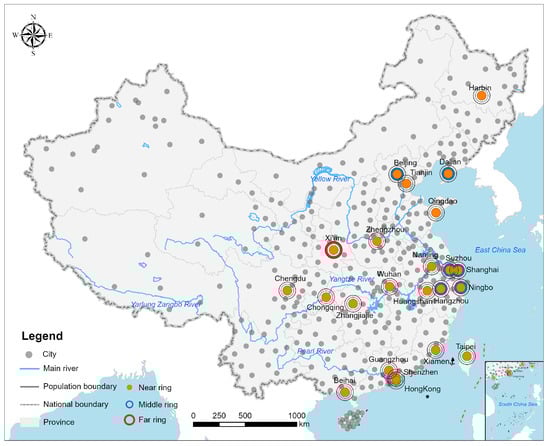 The spatial distribution of Chinese cities is uneven. Most cities are concentrated in the southern part of China’s population boundary and differ significantly in terms of economic foundations, natural conditions, social development, and cultural dissemination, as illustrated in Figure 2. China’s urban agglomerations are characterized by compact spatial organization, strong economic ties, a high degree of urbanization, and a high level of integration within urban groups. These agglomerations typically have more than one megacity as their core and at least three large cities as constituent units, with well-developed transportation and communication infrastructure networks within specific geographical areas. Examples include the Beijing–Tianjin–Hebei urban agglomeration, Yangtze River Delta urban agglomeration, Pearl River Delta urban agglomeration, and Cheng-Yu urban agglomeration.