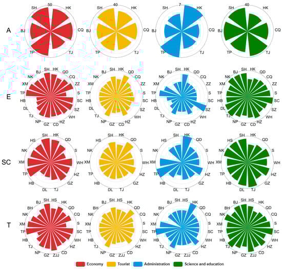 Fan city composition of star cities with different labels. Each line shows a star city with a specific label (the full name of each city can be found in the Appendix A). The vertical axes, A, E, SC, T, respectively, represent the city label of administration, economy, science and education, cultural tourism.