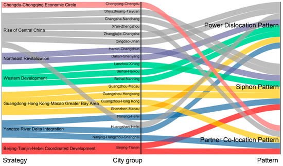 This study, based on attention flow mining, analyzes the influence of Chinese cities and identifies three patterns: power dislocation, partner co-location, and siphon patterns. These patterns are observed between geographically proximate non-provincial capital global star cities and non-global star provincial capitals, provincial capitals and global star cities, and non-local star provincial capitals and local star cities, respectively. In the context of regional planning, these patterns demonstrate the cross-fusion of reality and the virtual world in the information age. The relationships among regional planning strategies, city groups, and these three patterns are shown in Figure 14. Strategies such as the Beijing–Tianjin–Hebei Coordinated Development, Yangtze River Delta Integration, Guangdong–Hong Kong–Macao Greater Bay Area, Western Development, Northeast Revitalization, Rise of Central China, and Chengdu–Chongqing Economic Circle are major initiatives formulated by the Chinese government to promote regional complementarity and high-quality coordinated development across various regions, including the Beijing–Tianjin–Hebei region, the Yangtze River Delta, the Guangdong–Hong Kong–Macao Greater Bay Area, the western region, the northeastern region, the central region, and the Chengdu–Chongqing region.