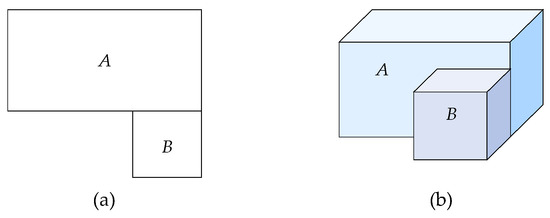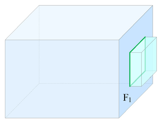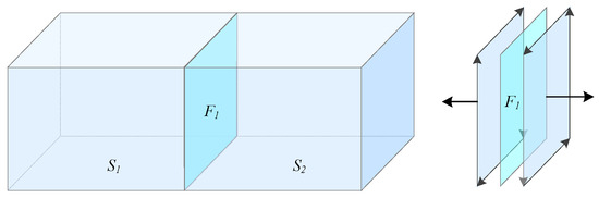 Since indoor spaces are space-paved, there is no gap among solids, and solids cannot intersect or penetrate each other; two adjacent solids adjoin on common faces. When two adjacent solids share a common face, the face is divided into two half-planes [37], and each half-plane is the boundary face of one of the two adjacent solids, while the normal vectors of the two half-planes are opposite. The topological adjacency relationship of two adjacent solids in indoor spaces can be described by a “half-plane”, as shown in Figure 6.