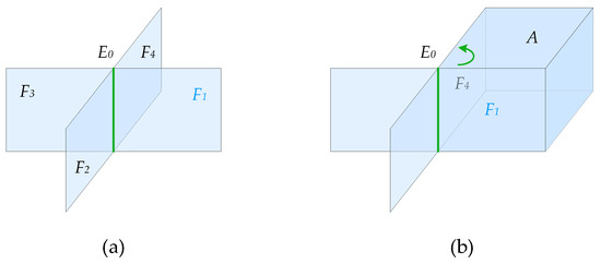 Since vector is the normal vector of the plane formed by the normal vectors of searched face Fi and initial searching face F0, is perpendicular to the plane formed by normal vectors and . Moreover, vector is the normal vector of face Fi , which is perpendicular to face Fi; then, vector is perpendicular to vector of common edge . Furthermore, vector is perpendicular to the plane formed by vectors and (). Hence, vector is parallel to vector ; that is, vectors and are either in the same direction or the opposite direction. According to the definition of the inner product of vectors, if , vectors and are in the same direction, and if , they are in the opposite direction.