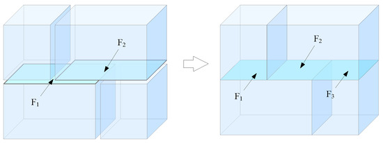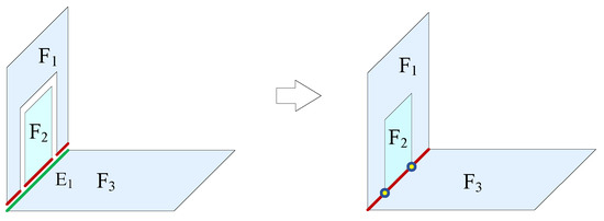 Faces only intersect at common edges in 3D indoor space; therefore, two intersecting faces need to be segmented at common edges so that each side of a face is only associated with one volume, as shown in Figure 7. In addition, due to the independence of CityGML surfaces, some common edges cannot be established among adjacent faces. Then, the edges need to be interrupted during node matching. In Figure 8, faces F1, F2, and F3 are CityGML surfaces, and the adjacent relationships of faces F1 and F2 can only be established via node matching. Therefore, edge E1 of face F3 needs to be interrupted to establish the adjacent relationships of faces F1, F2, and F3.