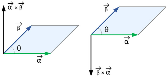 When vectors and are not parallel, the outer product of the vectors is a normal vector , perpendicular to the plane formed by vectors and , and the direction of vector follows the righ-hand rule, as shown in Figure 10.
