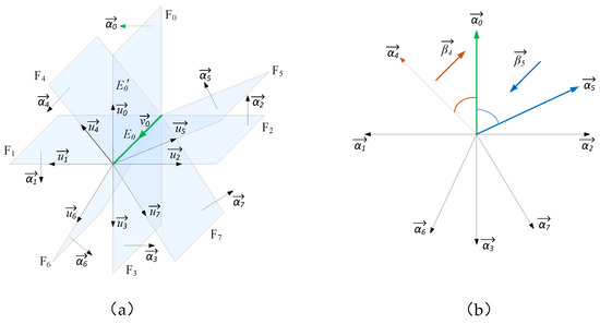 According to the definition of the outer product, by calculating the outer product of the normal vectors of every two faces, the normal vector of the plane formed by the two normal vectors can be obtained, and the direction of the normal vector derived follows the right-hand rule. Suppose is the vector obtained by calculating the outer product of the normal vectors of the searched face Fi and the initial searching face F0, namely, , as shown in Figure 11b (e.g., , ). According to Formula (4), if , then vector is parallel to ; that is, face Fi is parallel to F0. Thus, the angle between face Fi and F0 is 180° (such as face F3 in Figure 11a) due to the uniqueness of a face in the faces set. If , further determinations will be carried out.