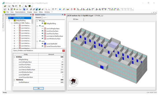 A CityGML 3.0 dataset of an office building is taken as raw data. The indoor spaces of the building consist of four floors named 2 level, 1 level, ground level, and basement with 688 surface elements of building components, of which InteriorWallSurface 277, CeilingSurface 23, FloorSurface 91, DoorSurface 84, WindowSurface 206, and ClosureSurface 7 are shown in Figure 15 (the ceiling surfaces are not shown for visualization).