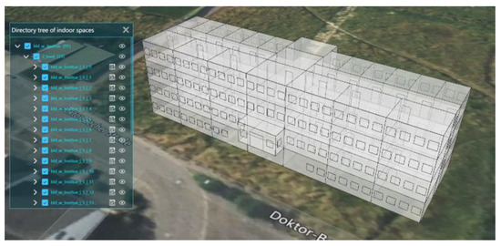 The city geography markup language (CityGML) building model [8] adopts several levels of detail (LoDs) to describe the geometric and semantic information of indoor functional spaces, building components, and indoor facilities. In addition, in the descriptions of topological relationships, CityGML adopts the XML concept of links (XLinks) to express the sharing relationships of public geometric objects [9], such as two volumes sharing common surfaces. The topological descriptions of CityGML XLinks can be used to represent two adjacent buildings sharing the same wall surfaces, which is simpler than that of the geography markup language (GML) [10] or ISO 19107 [11]. Therefore, CityGML is a suitable data model for describing the 3D indoor environment of buildings, and it has a wide range of applications in 3D city modeling and indoor location-based services [12,13,14,15].