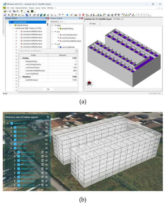 The 3D indoor dataset and the constructed indoor spaces. (a) A 3D indoor space simulation dataset based on CityGML. (b) The constructed indoor spaces of the building.